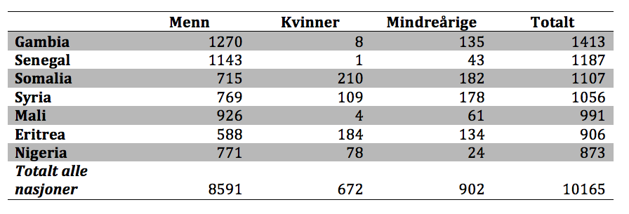 I årets første tre måneder kom 1.413 gambiere sjøveien til Italia. For gambierne var 90 prosent menn, mens det kom bare åtte kvinner. 135 var mindreårige. Etter Gambia følger Senegal, Somalia, Syria, Mali, Eritrea og Nigeria. Jamfør tabell under.