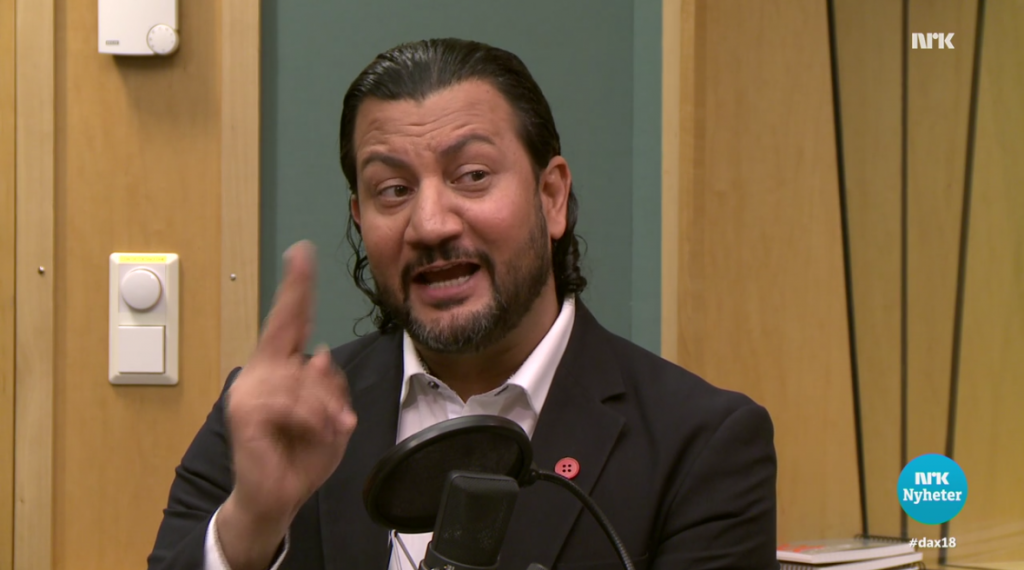 Afsar spiller høyt med den største selvfølgen. Selvsagt, for hvem våger å utfordre han ideologisk? Skjermdump fra gårsdagens Dagsnytt atten.