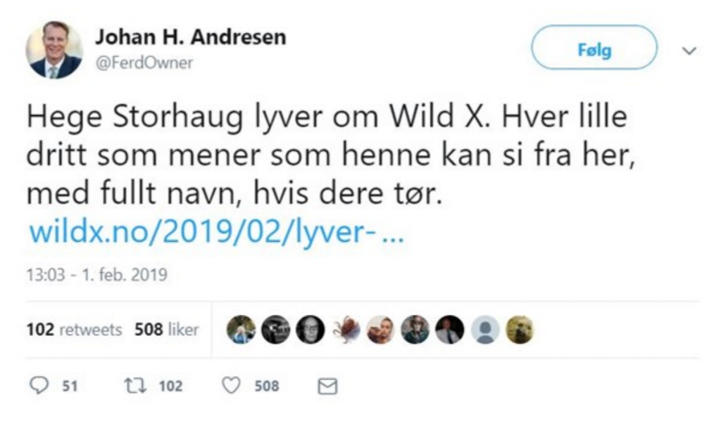 Her tok Johan Henrik Andresen Wild X i forsvar ved å hevde at Hege Storhaug lyver – og det på en særdeles lite taktfull måte. Selvsagt må Andresen få være uenig med hvem han vil, men reglene for anstendig tone og belegg for sine påstander gjelder vel selv om en er blant de rikeste i landet?