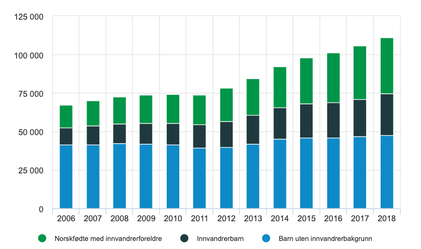 Selv om barn med innvandrerbakgrunn utgjør knappe 17 prosent av alle barn (over en treårsperiode), har de etter 2012 utgjort flertallet av alle barn i husholdninger med vedvarende lavinntekt. I 2018 var denne andelen på 57,2 prosent, mot 38,8 prosent i 2006.