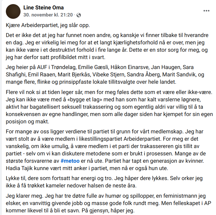 – Marte, Hadia og Ingvild, de sterkeste damene i gruppen, gjør Giskes comeback enda lettere. Og det orker jeg ikke tenke på hvordan skal bli, skriver hun før hun avslutter med å erklære at Arbeiderpartiet er i en dyp krise.