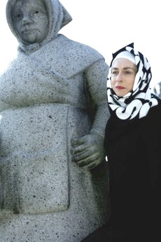 Elsebeth Gerner Nielsen ikledd muslimsk hodeplagg sammen med statue av «skaut-kvinne». To sider av samme sak?