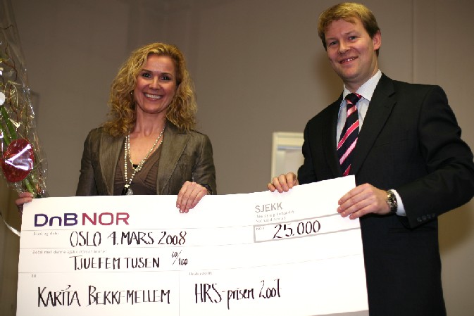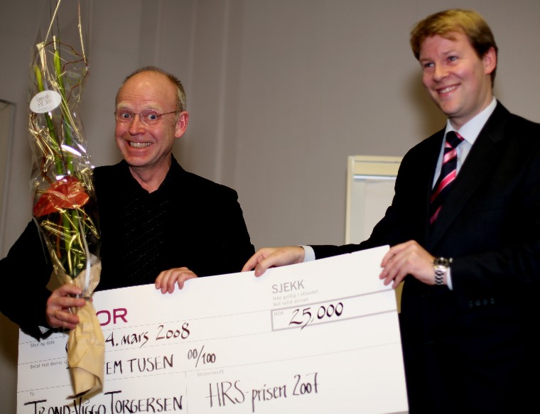 Styreleder i HRS, Carl August Ameln, overrekker Trond-Viggo Torgersen prisen på 25.000 kroner som er sponset av Cron Industrier AS, Peter Meidell og Jenny Strindler.