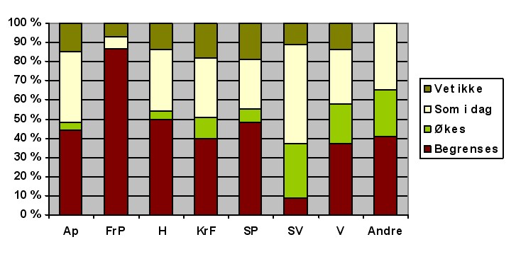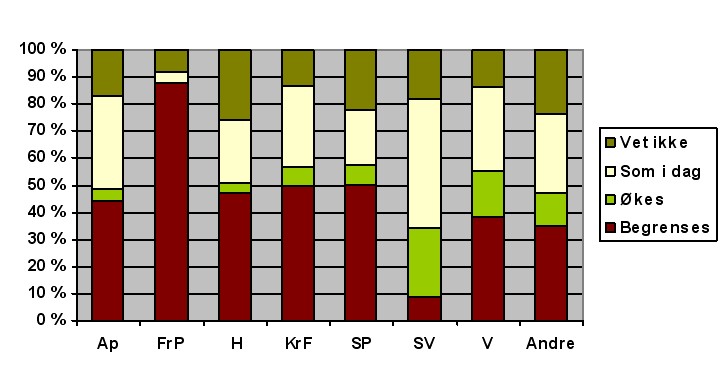 Det som imidlertid skiller seg markant ut, er partitilhørighet. Hele 87 prosent av FrP-velgerne vil begrense den ikke-vestlige innvandringen, og i motsatt ende finner vi SV-velgerne, der kun 9 prosent ønsker slik begrensning. For de øvrige partiene ønsker 50 prosent av Høyrevelgerne begrenset ikke-vestlig innvandring, 48 prosent av Sp-velgerne, 44 prosent av Ap-velgerne, 40 prosent av KrF-velgerne, og 37 prosent av Venstrevelgerne. For andre partier ønsker 41 prosent av velgerne en slik begrensning.