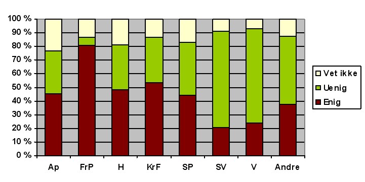Av de 16 prosentene som ikke har gjort seg opp noen mening om saken, er dette enten mann eller kvinne (begge 16 %), typisk under 30 år (32 %), men husstandens inntekt ligger over 200.000 kr, bor i Nord-Norge (26 %), husstanden har flere enn fire personer (24 %) og stemmer hva som helst, men ikke typisk FrP (7 %). Det har ingen betydning om vedkommende bor i by, tettsted eller på landsbygda, og det har heller ingen betydning hvilken utdanning vedkommende har.