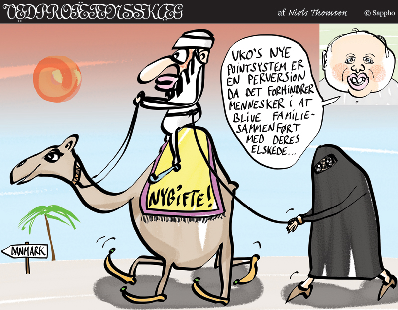 Niels Thomsons tegning denne uken tar for seg det nye poengsystemet i Danmark for henting av ny ektefelle.