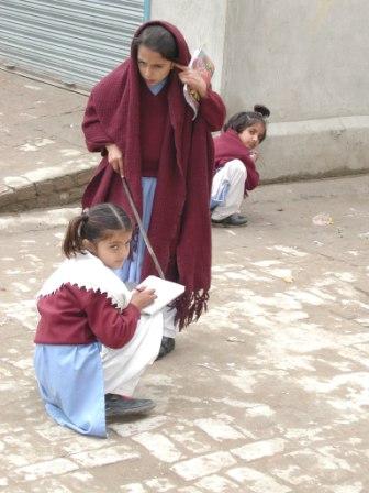Fra en vanlig skolehverdag i Pakistan. Den eldre jenta hører den yngre, og ved feil svar vanker det slag med kjeppen. Foto: Rita Karlsen