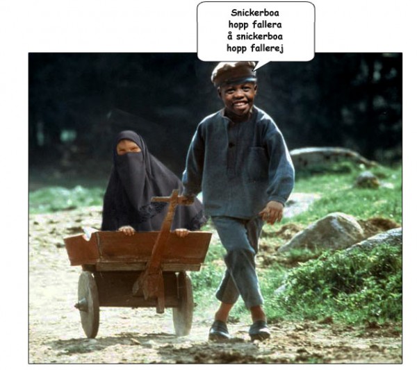 Historierevision kallas det när man ändrar det förflutna för att passa i en modernare låtsasideologi. När får vi se Astrid Lindgrens älskade buspojke Emil i Lönneberga som svart med lillasyster Ida i niqab? (Se Affes bildmontage tidigare i texten.)