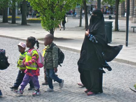Er dette et skue vi bare må venne oss til i gatebildet? Og er det greit at barnehageansatte jobber fullt tildekket? Er det ingen som vil gjøre noe – bare fordi det er så få? Foto: HRS-leser |