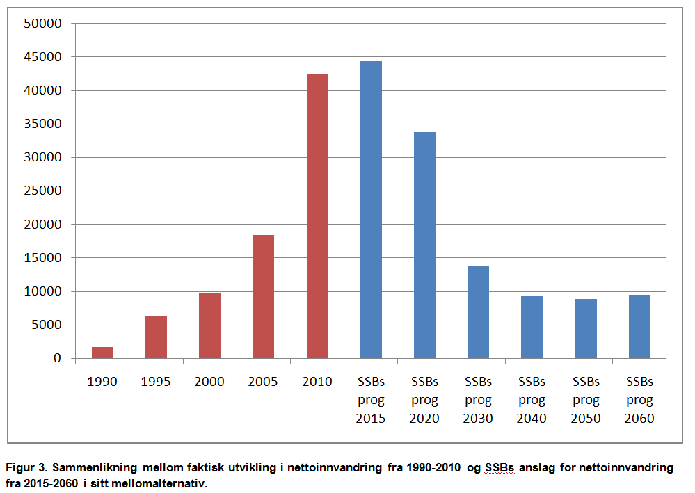 Det alternativet som ligger nærmest den faktisk observerte innvandringen, er som vanlig SSBs høyalternativ. Men selv dette ligger, som figur 1 viser, lavere enn den faktisk observerte gjennomsnittlige nettoinnvandringen i perioden 2007-2010, som var på drøyt 41.000 personer per år.