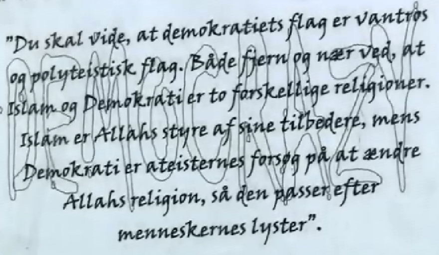 Du skal vite at demokratiets flagg er de vantros og polyteistiskes (flerguderi, red. anm.) flagg. Både fjern og nær vet at islam og demokrati er to forskjellige religioner. Islam er Allahs styre av sine tilbedere, mens demokrati er ateistenes forsøk på å endre Allahs religion slik at den passer til menneskenes lyster.