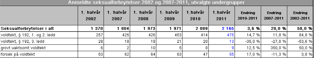 Nå tror jeg uansett ikke Sverige er et land vi skal se for mye til, da utviklingen hva gjelder seksuelle overgrep i Sverige i mine øyne er mer enn alarmerende. Aldri før har så mange voldtekter blitt anmeldt som i 2009, og økningen er særlig høy av voldtekter mot barn under 15 år. I 2009 ble det anmeldt 15.000 seksualforbrytelser i Sverige, herunder i underkant av 6.000 voldtekter. Samtidig antas det at mørketallene for voldtekter kan ligge på et sted mellom 50.000 – 100.000.