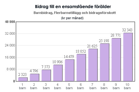 • Barnbidrag 1 050 kronor i månaden per barn.• Flerbarnstillägg med 150 kronor från barn nummer två. Flerbarnstillägget ökar för varje barn.• Eftersom kvinnan klassas som singelmamma får hon 1 273 kronor i månaden i bidragsförskott för varje barn.