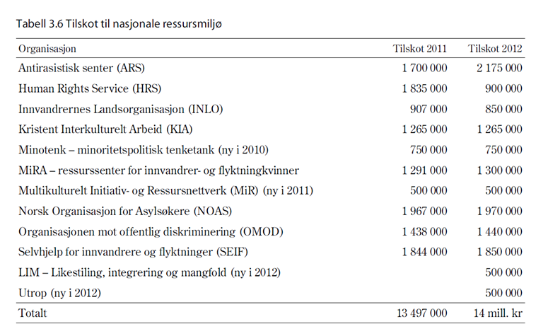 Statsrådens/BLDs forslag på nettopp pkt.2) ”tilskot til drift av nasjonale ressursmiljø på integreringsfeltet” innebærer at dette er en ny tilskuddsordning. Dette fordi forslaget er utlagt som øremerkede tilskudd til organisasjoner (eller det som nå er foreslått å hete ”nasjonale ressursmiljø på integreringsfeltet”) der statsråden/BLD fastslår hvem det skal være og fordelingene mellom disse, jf. forslag til fordeling i tabell 3.6 (gjengitt over). Som det fremkommer av forslaget argumenterer statsråden/departementet sin fordeling med at ”desse organisasjonane, stiftingane og sentra vil gi den nødvendige balansen mellom breidde, fornying og kontinuitet, jf. formålet med ordninga.”