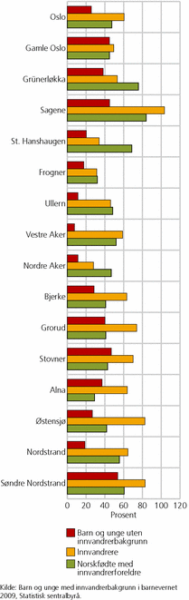Ved inngangen til 2010 hadde 32 prosent av barn og unge i Oslo innvandrerbakgrunn, mens det var for resten av landet var 9 prosent. Et segregert bosettingsmønster i Oslo gir seg utslag i både ulike brukergrupper og betydelige utgiftforskjeller mellom bydelene. SSB har sett nærmere på klientrater og kostnader for barnevernet.