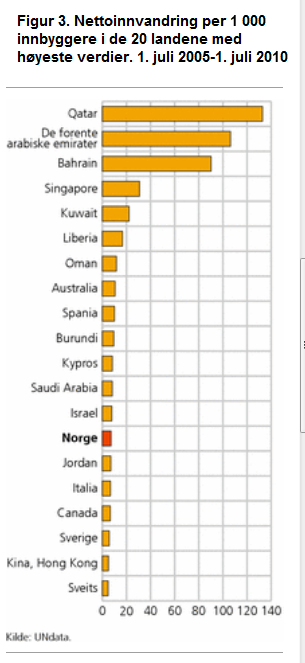 Samtidig påpeker Vassenden at avstanden mellom landene som ligger på Norges nivå, er såpass liten at rangeringen lett endres fra år til år. Ser en på tida før finanskrisa, lå også Spania, Kypros, Irland og Island høyt og en god del høyere enn Norge. Men uansett hvordan en analyserer tallene, får en at nettoinnvandringen til Norge nå ligger høyt i forhold de fleste av verdens land.
