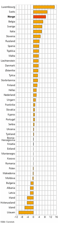 Ut fra tallene til Eurostat for 43 europeiske land (Eurostat 2012), etter å ha unntatt mikroland som San Marino og Andorra, er bildet i Europa på slutten av perioden 2000-2010 at et annet småland, Luxembourg, ligger høyest på lista og med god margin til de neste landene. Sveits sin andreplass ble overtatt av Russland i 2010. I gjennomsnittstallene for de tre årene 2008-2010 blir Norge nummer 3, litt etter Sveits og litt foran Belgia, Sverige og Italia.