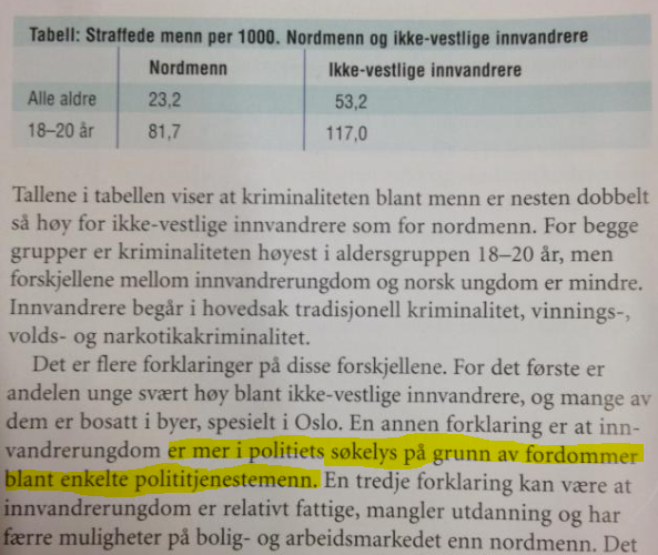 I ny agenda, samfunnsfag for videregående opplæring (Cappelen Damm), synes lærebokforfatterne å ha funnet svaret på en gåte som resten av samfunnet grubler på: Hvorfor er ikke-vestlige innvandrere overrepresentert på kriminalitetsstatistikken?
