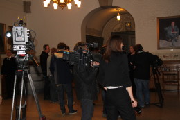 Pressen venter i spenning på at Hedegaard skal vise seg for første gang etter attentatet. Her kanskje 25 prosent av fremmøtte «kamera».