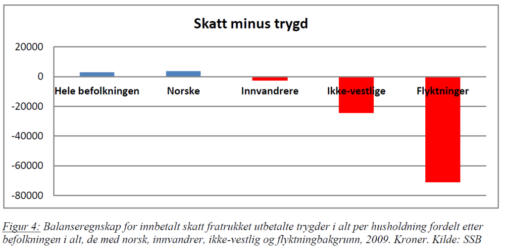 Som Finansavisen påpeker har innvandrerbefolkningen økt med 290.000 personer siden 2005. Disse er fordelt på 246.000 i nettoinnvandring (inn- og utvandring) og 44.000 i netto fødselsvekst. (Økningen er nok reelt sett høyere enn dette, da det kommer an på hvordan en definerer ”innvandrerbefolkningen”). Av disse var 15.400 ikke-vestlige innvandrere, som i sum innebærer en nettokostnad på 63 milliarder kroner. Dette fordi de betaler betydelig mindre i skatter og avgifter enn de tar ut i trygder og stønader. Dette overforbruket har Finansavisen sammenlignet til å tilsvare to bistandsbudsjett eller omlag halvparten av de 125 milliarder kroner staten vil bruke av oljepengene i år.