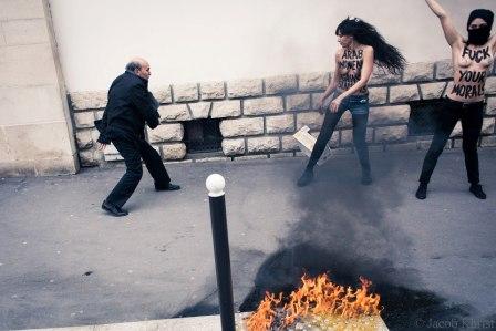 Tunisian FEMEN activist Meriam burned a salafist flag in front of the Grande Mosquée de Paris today at 4PM as a symbol of women’s fight against wild religious extremism. The Arab sextremist gave a sign of women’s stand-off to those who kill and rape in the name of Allah. The recent call of Tunisian salafists to stone Tunisian activist Amina was the last step before a big women riot.