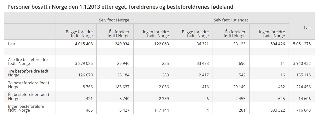 Norske er altså (per statistisk definisjon) personer som er født i Norge med norskfødte foreldre og fire norskfødte besteforeldre. SSB har summert opp de ulike kategoriene i følgende tabell (se under, faksimile fra SSB), etter hvor en selv er født (Norge eller utlandet), og videre hvor foreldrene (begge) er født og hvor besteforeldrene (fire) er født: