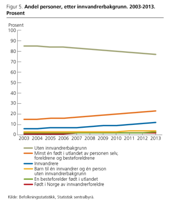 Det har derimot SSB formidlet ved hjelp av en figur (se under), som blant annet viser at andelen av den norske befolkningen går ned, først og fremst som et resultat av den høye innvandringen. Som andel av den samlede folkemengden har andelen nordmenn sunket fra 85 prosent i 2003 til 77 prosent i 2013.