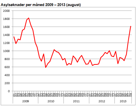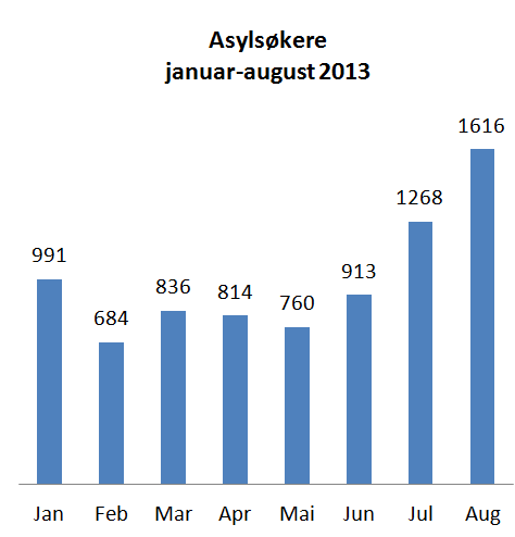 Alt tyder på at 2013 blir året da asyltallene igjen steg. Bare i august kom det 1.616 asylsøkere, melder NRK. Det innebærer at så langt i år er det kommet 7.882 asylsøkere, som er 29 prosent høyere enn for samme periode i 2012.