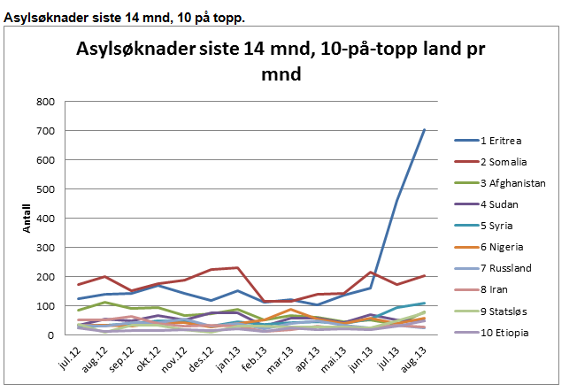 Det er primært eritreere som utgjør økningen i tallet på asylsøkere. Hvorfor det kommer så mange asylsøkere fra Eritrea til Norge nå, har UDI ikke noe svar på. Derimot sier Forfang at de som kommer som asylsøkere, «vil vi sannsynligvis kunne ønske velkommen som nye landsmenn».