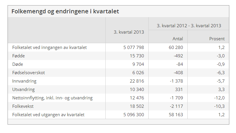 SSB: Folkemengd og kvartalsvise befolkningsendringar, 3. kvartal 2013