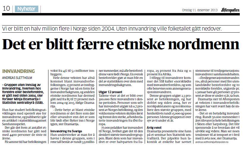 At andelen «etniske nordmenn» (som jeg betviler er et begrep Dzamarija benyttet) har sunket fra 85 til 77 prosent på så få år, er en oppsiktsvekkende nyhet fra SSB. At de ikke har formidlet dette før, er fordi de ikke har visst det? Eller at de anser det som informasjon uten betydning? Som nevnt over har de i alle fall hatt tallene, og første gang de antydet slik kunnskap var når de la frem befolkningsfremskrivningen i 2012 (etter at FrP hadde fått tallene om alle befolkningsgrupper i Norge). Da glapp det ut av SSB at 000-gruppen er «de norskeste av de norske» (har omtalt dette tidligere, hvor jeg også forklarer grupperingene 000, 024 osv).