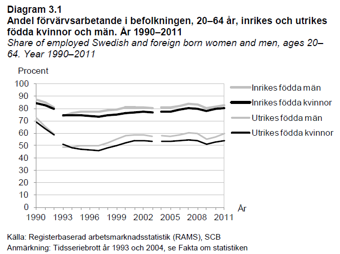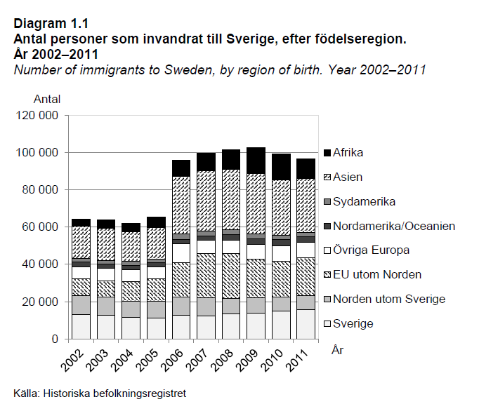 SCB påpeker at det først og fremst er i den ikke-vestlige befolkningen (fra Afrika og Asia) at økningen har vært størst, som gjelder både i antall og andel. I 2011 hadde 9 prosent av Sveriges innvandrerbefolkning bakgrunn fra Afrika, mens hele 30 prosent hadde bakgrunn fra Asia. Dette er grupper, sier SCB, som består av mange unge personer i yrkesaktiv alder hvor mange har vært mindre enn fem år i Sverige. Jf. faksimile av figur fra SCB-rapporten, der det også fremkommer en betydelig vekst fra EU utenom Norden, som i hovedsak består av nye østeuropeiske medlemsland i EU.