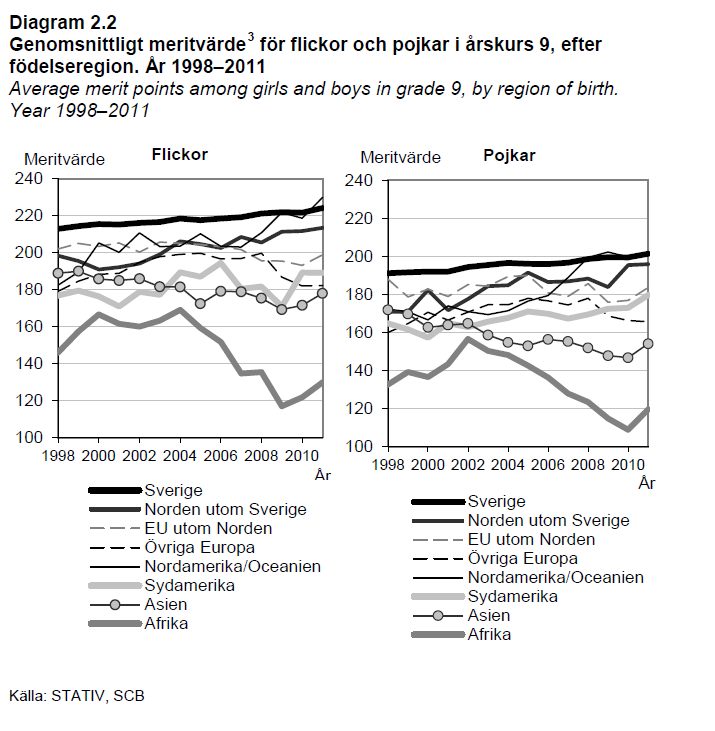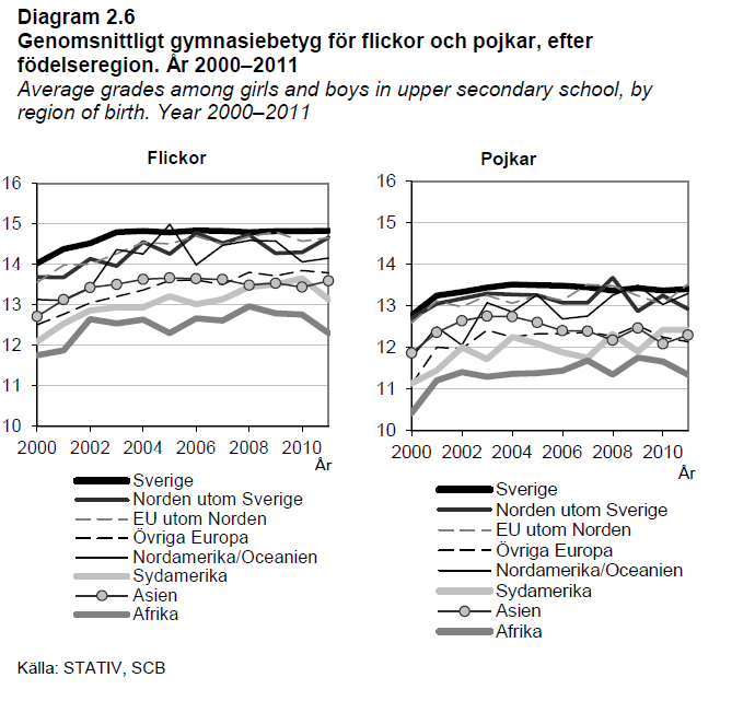 Innvandrerelever hadde i årene 1998-2010 lavere snittkarakter i grunnskolen sammenlignet med den øvrige befolkningen. Samtidig gjorde jentene det bedre enn guttene, sammenlignet med de samme sitt fødeland. Det samme gjør seg gjeldende på videregående skole. Innvandrerelever med kort botid i Sverige gjør det betydelige dårlige enn de øvrige, også til inntak på videregående skole. Se faksimile av figurer fra SCB-rapporten.