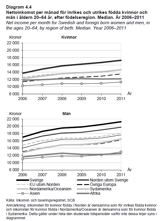 Gjennomsnittlig inntekt (medianinntekt) for 20–64 år var 14 400 SEK per måned for innvandrere og 19 000 SEK per måned for innvandrere. Jf. faksimile av figur.