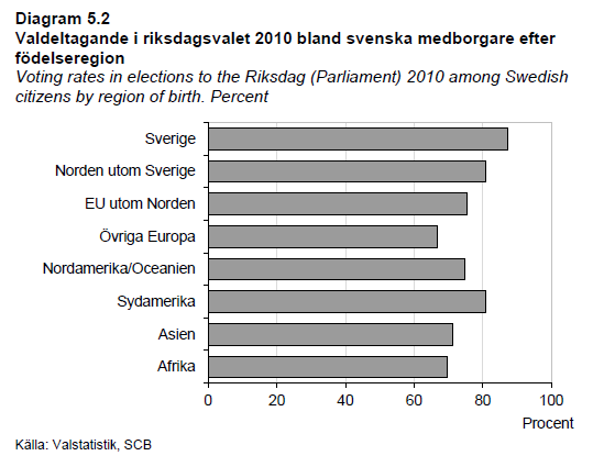 Innvandrere benytter sin stemmerett i mindre grad enn den øvrige befolkningen. Denne forskjellen økte mellom riksdagsvalget i 1991 og 2006, men har siden gått ned. I 2006 var forskjellen på 18 prosentpoeng, i 2010 på 14 prosentpoeng, i 2010 på 87 prosent for øvrig befolkning og 73 prosent for innvandrerbefolkningen.