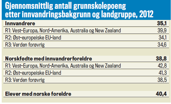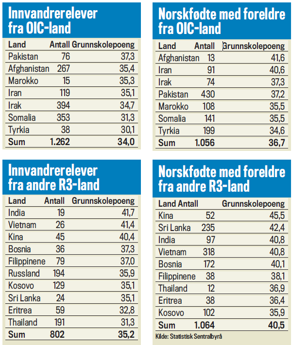 I Finansavisen i dag presenteres SSBs oversikt over skoleresultat blant grupper med ulik landbakgrunn. Barn født i Norge av kinesiske foreldre utkonkurrerer alle andre grupper, inkludert norske elever. Også Sri Lanka, Vietnam og India slår de norske elevene.