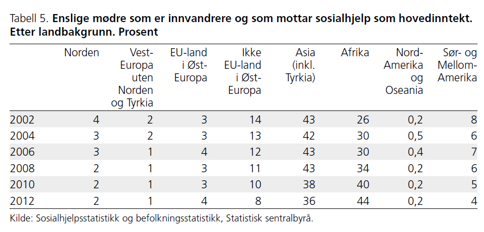Ifølge Statisk sentralbyrå (SSB) viser tall for 2002-2012 at stadig flere alenemødre har sosialhjelp som hovedinntekt, men der sammensetningen av gruppen har endret seg. Flere er innvandrermødre, der morens landbakgrunn også har betydning.