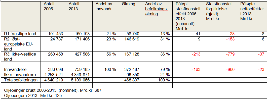 At så få er sysselsatt gir manko i regnskapet og staten må bruke oljepenger på å tette hullene. Ifølge Finansavisen benyttet den rødgrønne regjeringen rundt en fjerdedel av oljepengene i perioden for å tette hullene i innvandringsregnskapet.