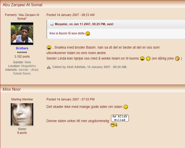 Flere i Rabitamoskeen kjente altså til terroristen. De bør også ha kjent til de ekstreme holdningene hans, for dem la han aldri skjul på – verken på islam.no eller på 7cgen. Vi har ikke registrert at en rekke posteringer med grovt innhold ble korrigert eller tatt avstand fra på nettstedet islam.no, heller ikke av administrator Basim Ghozlan.