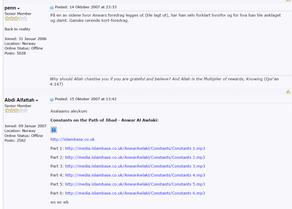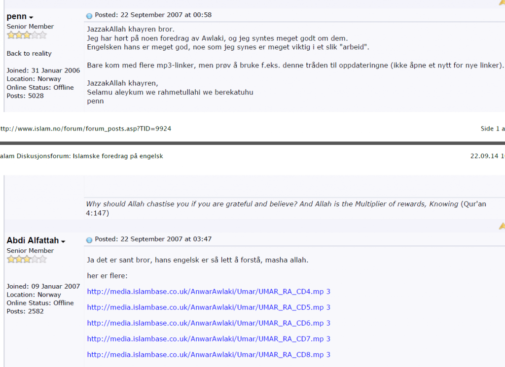 Bare i denne ene tråden på islam.no har Dhuhulow uforstyrret lagt igjen flere titalls lenker til Awlakis foredrag. Vi har hele tråden lastet ned i PDF-fil.
