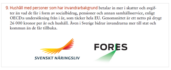 Et annet eksempel som dras opp, er fra Migrationsinfo.se: «Företag drivna av personer med utländsk bakgrund hade större personalomsättning och sysselsatte fler per år än inrikes födda företagare.» Påstanden videreføres på regjeringens hjemmeside (sågar under logoen fakta mot fördomar): «Studier visar också att företagare med utländsk bakgrund har fler anställda per företag än personer med svensk bakgrund.»