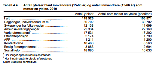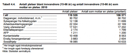 De 793 200 ytelsesmottakerne (som altså gjelder hele befolkningen, inkludert innvandrere) tilsvarte 23,6 prosent av Norges befolkning i alderen 15-66 år. Av disse mottakerne var 106 600 innvandrere (altså 1.generasjon), noe som tilsvarte 24,5 prosent av alle innvandrerne i alderen 15-66 år. Igjen får jeg opplevelsen at det ikke blir meningsfullt å inkludere innvandrerne i prosentandelen for hele befolkningen.