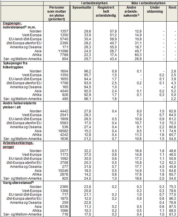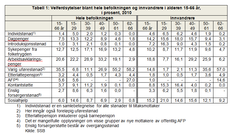 Ser vi på innvandrere (15-66 år) fra henholdsvis Norden, Vest-Europa utenom Norden, EU-land i Øst-Europa, fra Øst-Europa utenom EU, Amerika og Oseania, Asia, Afrika, samt Sør- og Mellom-Amerika som mottar velferdsytelser, etter type velferdsytelse, og om de er sysselsatt, registrert helt ledige, andre arbeidssøkere, under utdanning eller ingen av delene (restgruppen), fremkommer det store variasjoner vedrørende å motta velferdsytelser og ikke delta i arbeidslivet. Kolonnen «Personer som mottar en ytelse» er prioritert, som deretter fordeles i prosent på de ulike kategoriene (tall fra 2010). Denne tabellen er en sammenslåing av vedleggstabell A1-A8 i SSB-rapporten.