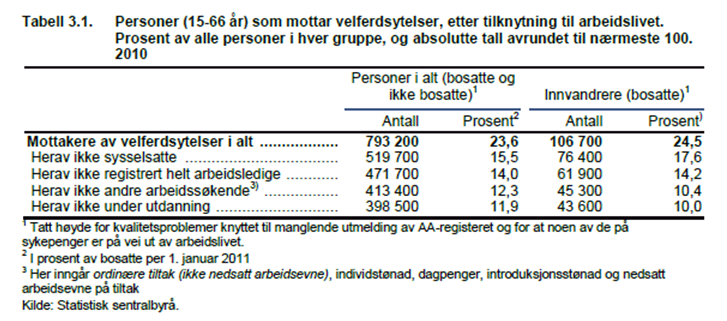 I tillegg var noen av disse 793 200 også sysselsatt, nærmere bestemt 273 500. Det tilsier at 519 700 ytelsesmottakere i alderen 15-66 år var ikke sysselsatt. Det tilsvarer 15,5 prosent av befolkningen i samme alder. Av disse var 76 400 innvandrere, slik at 17,6 prosent av innvandrerne mottok velferdsytelser uten å være sysselsatt. Jamfør faksimile av tabell fra SSB: