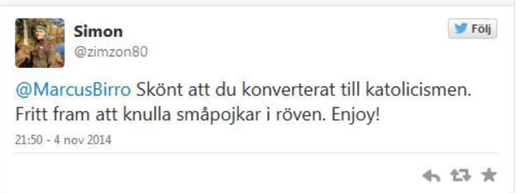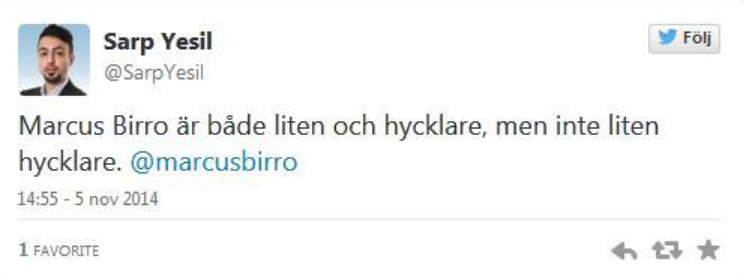 Samma dag twittrade han till Birro: «Du med ditt enfaldiga rasistiska islam-hat @MarcusBirro, men jag kommer bli ännu mer trött när du gråter ut om «hatet» DU låtsas få.»