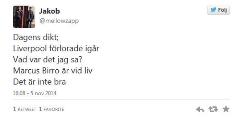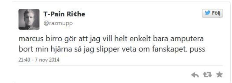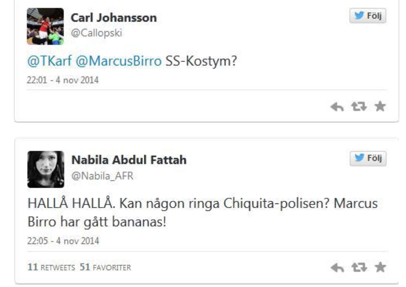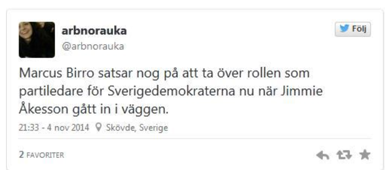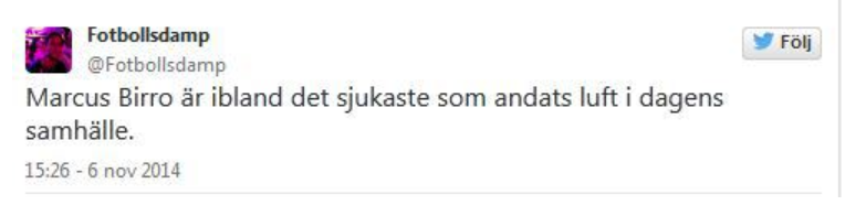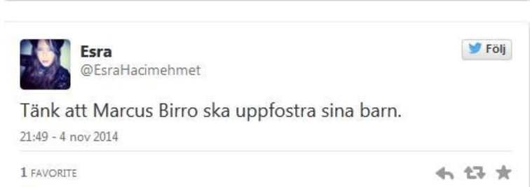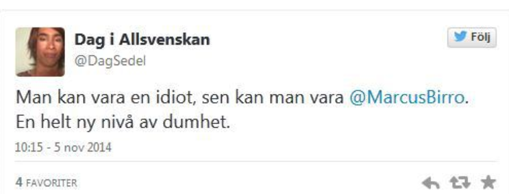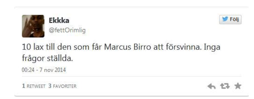 Dette førte selvsagt ikke til at det roet seg i sosial medier. Birro la ut følgende på Twitter 8.november, altså dagen etter lederartikkelen i Aftonbladet: