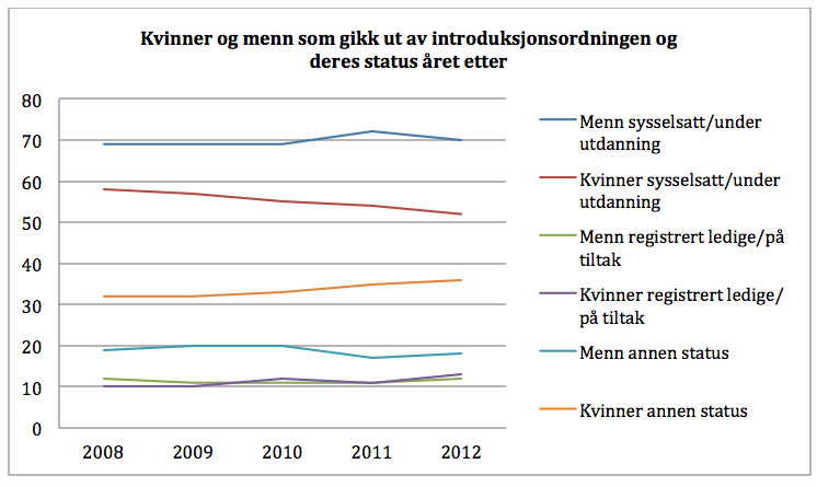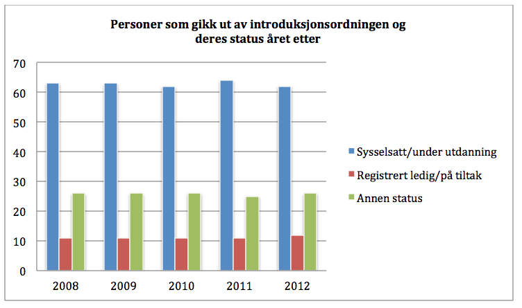 SSB har publisert ny årgang om deltakere i introduksjonsordningen sin overgang til utdanning og arbeid. Tallene for siste årgang er de svakeste noensinne. Bare en av tre (35 prosent) var i arbeid per november 2013 av dem som avsluttet i 2012. Dette er en nedgang på 3 prosentpoeng fra forrige kull. Tidligere var 40 prosent i arbeid året etter avsluttet introduksjonskurs. For 2008-kohorten var over 50 prosent i arbeid.