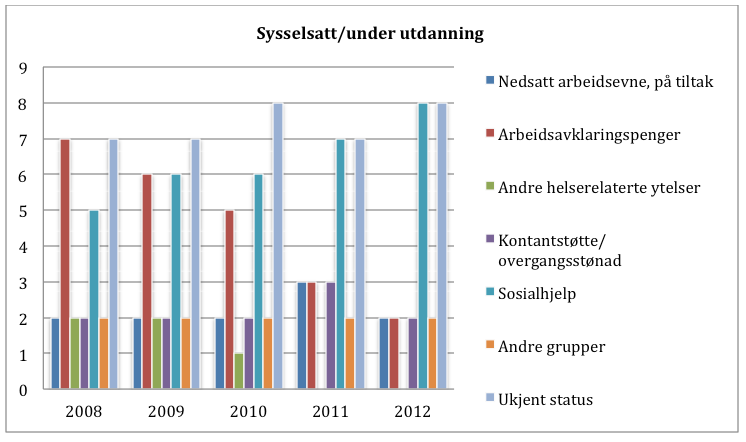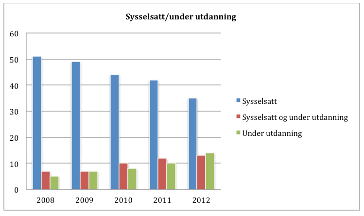 - Sysselsatt og under utdanning (utdanning defineres her av SSB som videregående opplæring og høyere utdanning. Overgang til grunnskoleopplæring blir ikke regnet med i tallene for personer som er under utdanning. Grunnen til dette er at det per i dag ikke finnes noe register på personnivå over personer som deltar i grunnskolen (noe HRS for øvrig har etterlyst i årevis). I grunnskolens Informasjonssystem er enheten hver enkelt grunnskole.)