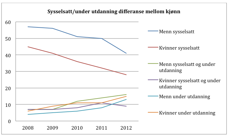 Differansen mellom menn og kvinner er påtakelig. De siste tallene (2012-kohorten, status på arbeidsmarkedet i november 2013) viser for eksempel at bare 28 prosent av kvinnene var sysselsatt, se under.