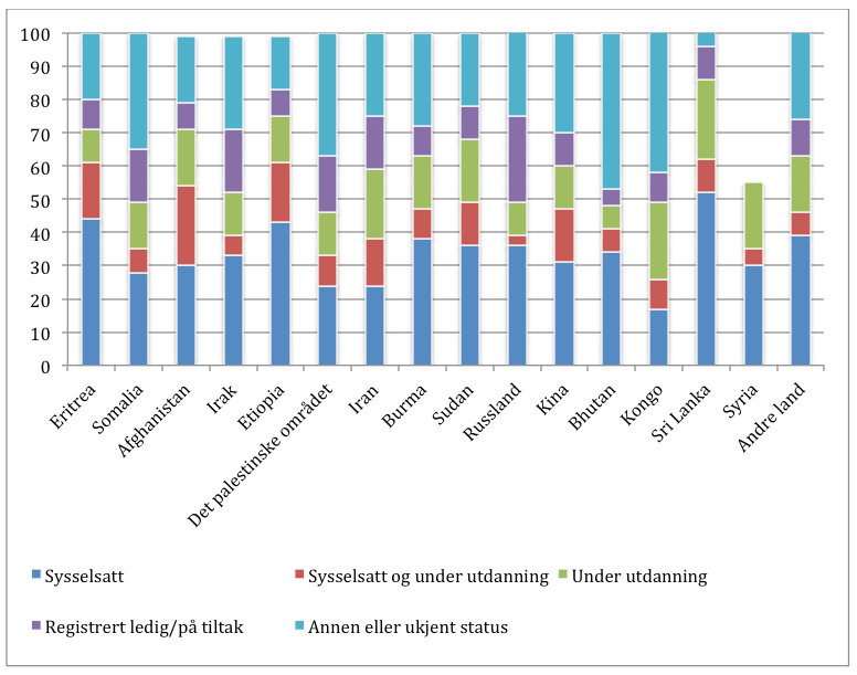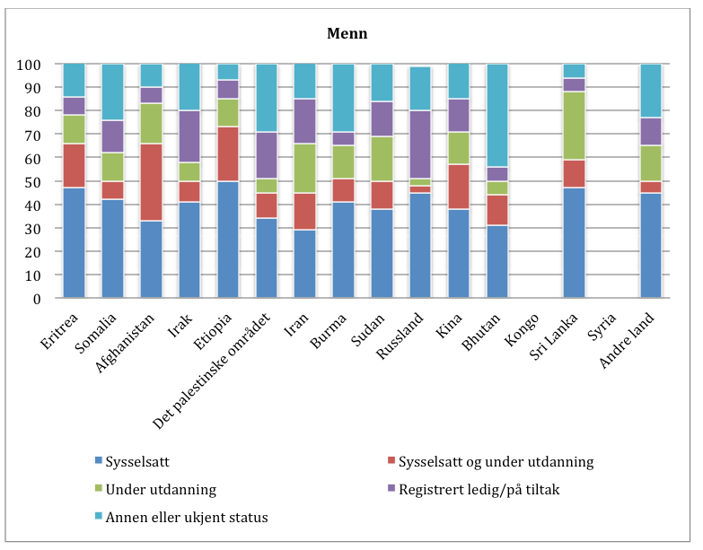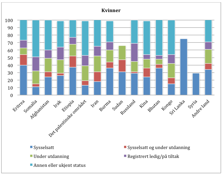 Vi ser også at det er betydelige forskjeller mellom kvinner og menn. For eksempel var bare 11 prosent av somaliske kvinner sysselsatt, 13 prosent fra det palestinske området og 15 prosent fra Kongo.